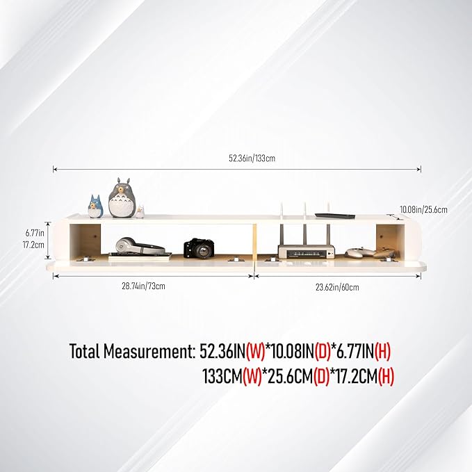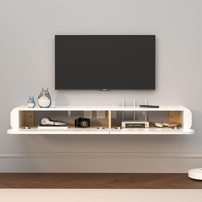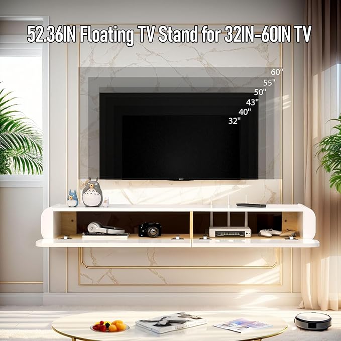 Floating TV Stand in Solid Wood, 52'' High Gloss Wall Mounted TV Cabinet, Floating TV Shelves with 2 Large Doors, Modern Entertainment Media Console Center Large Storage TV Bench (52.36IN)
