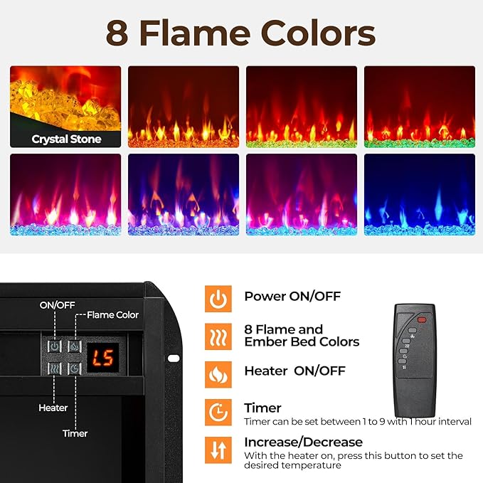 About This Inset Electric Fireplace: The color-changing electric fireplace has 9 temperature levels that can be adjusted between 64°F and...