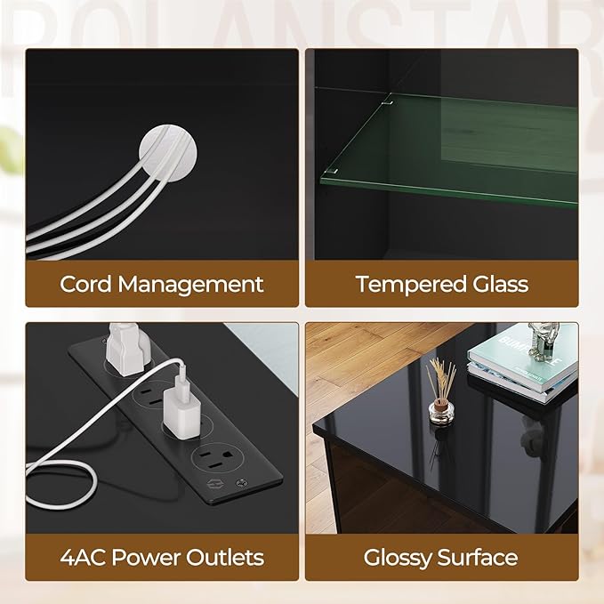 Rolanstar Fireplace TV Stand with Led Lights and Power Outlets, TV Stand for 45/50/55/60/65 inch TVs, Entertainment Center with Electric Fireplace, Modern TV Console with Glass Shelves, Glossy Black
