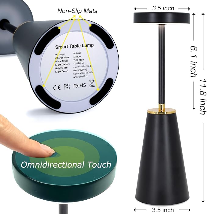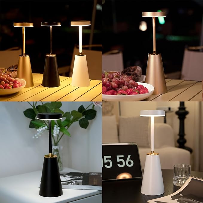 • šŸŽLED Cordless Lamps for Tables--3 Color temperatures are White(6000K), Warm White(4500K), Warm(3000K) with touch sensor switch control on the top of the desk lamp. Turn on/off and switch the lighting mode by clicking, long press to adjust the light brightness from 4%-100% with stepless dimming function.