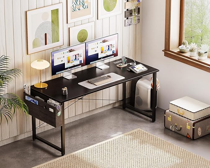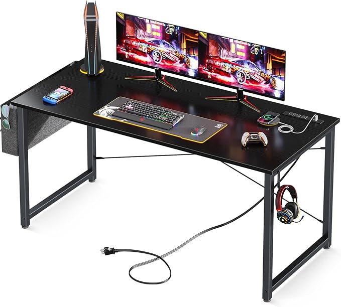 AODK 55 inch Small Computer Desk with Power Outlet for Small Spaces Home Office Student Laptop PC Writing Desks with Storage Bag Headphone Hook, Black
