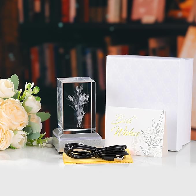 3D Crystal Lavender Gifts For Women - Lavender Flowers with Colorful Light Base Laser Engraved - Fake Flower Lavender Figurines Room Party Classroom Nature Decor Lavendar Statue Decorative Birthday De