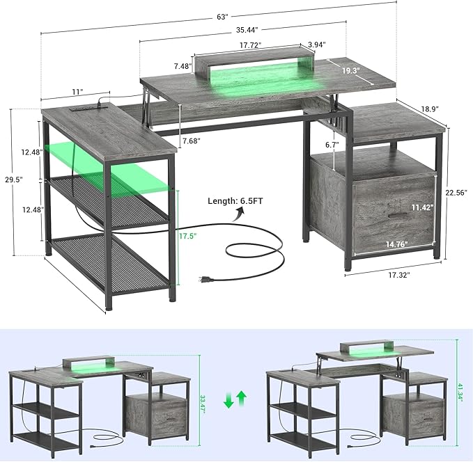 Aheaplus L Shaped Desk with Power Outlet, Standing Home Office Desk with Lift Top and File Drawer, 63'' Corner Computer Desk with Monitor Stand&Printer Shelves, Gaming Desk with Led Lights, Grey Oak