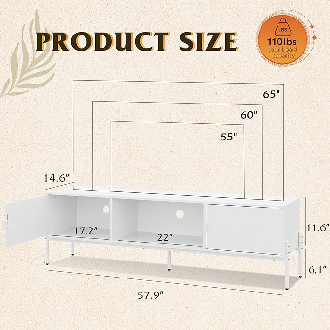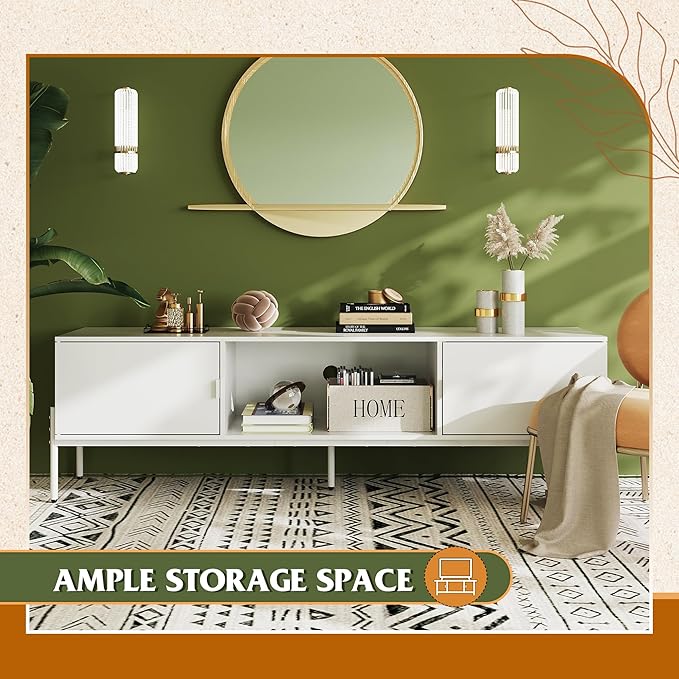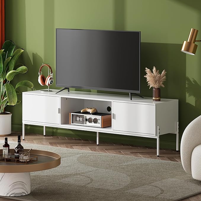 WLIVE Modern TV Stand for 65 Inch TV, Mid Century Entainment Center with Storage, TV Console with Open Shelf and 2 Cabinets for Bedroom and Living Room, TV Cabinet with Metal Legs, White