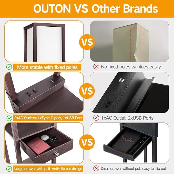 OUTON Deluxe Shelf Floor Lamp with 1 Drawer, 2 USB-C Ports, 2 AC Outlets, LED Modern Floor Lamp with 3 Color Temperature, Storage Display Wood Standing Lamp for Living Room, Bedroom, Office (Walnut)