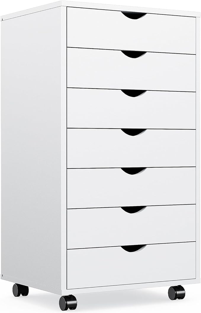 OLIXIS 7 Drawer Chest Wood File Cabinet Rolling Organization Storage Dresser with Wheels for Home Office, 15.75" D x 18.74" W x 34.25" H, White