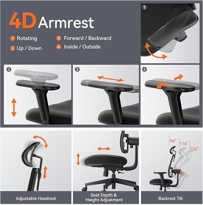 Newtral Ergonomic Home Office Chair, High Back Desk Chair with Unique Adaptive Lumbar Support, Adjustable Headrest, Seat Depth Adjustment, 96°-126° Tilt Function, 4D Armrest Recliner