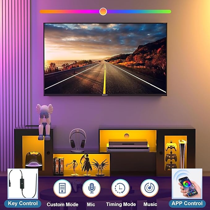 VECELO LED TV Stand for Televisions up to 70 Inchs Modern Entertainment Center with Storage Media Console with 23 Flashing Options and 4 Customizable Modes for Living Room, Bedroom, Black