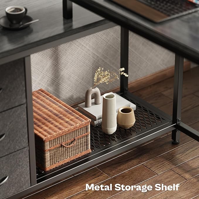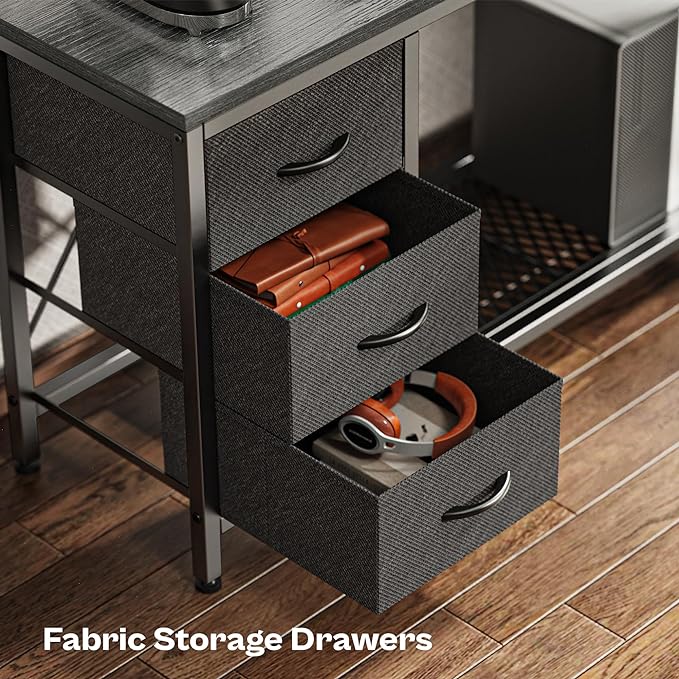 Reversible L Shaped Computer Desk with Drawers, Gaming Desk with LED Lights and Power Outlets, Office Desk with Storage Shelves, Corner Desk with Monitor Stand, for Home & Office, Gray