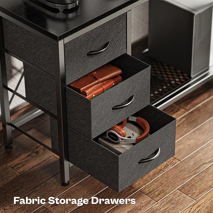 Reversible L Shaped Computer Desk with Drawers, Gaming Desk with LED Lights and Power Outlets, Office Desk with Storage Shelves, for Home & Office, Black