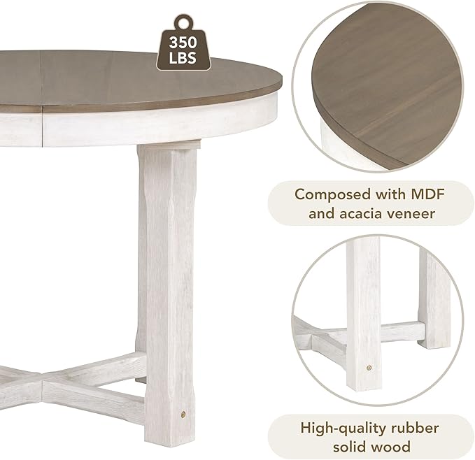 Farmhouse 5 Piece Dining Set, Included Round Extendable Wooden Table and 4 Upholstered Chairs, Retro Adjustable Dinette Furniture for Kitchen Living Room, Brown+White