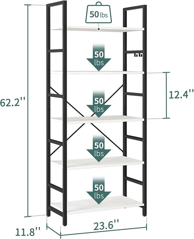 Yoobure 5 Tier Bookshelf - Tall Book Shelf Modern Bookcase for CDs/Movies/Books, Rustic Book Case Industrial Bookshelves Book Storage Organizer for Bedroom Home Office Living Room White