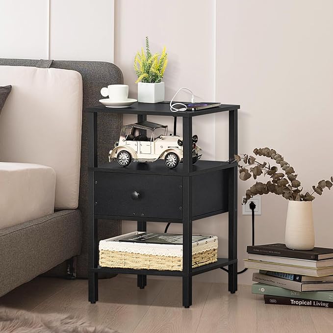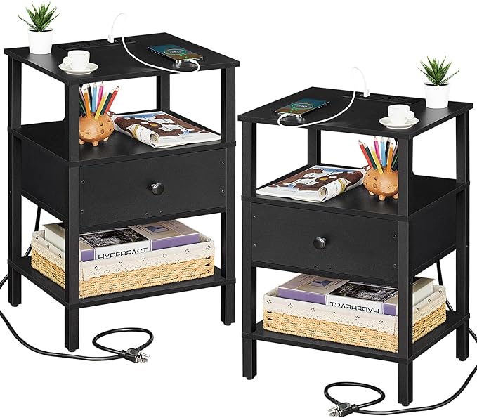 Lerliuo Nightstand Set of 2 with Charging Station and USB Ports, 3-Tier Storage End Table with Drawer Shelf, Night Stand for Small Spaces, Wood Bedside Table for Living Room, Bedroom - Classic Black