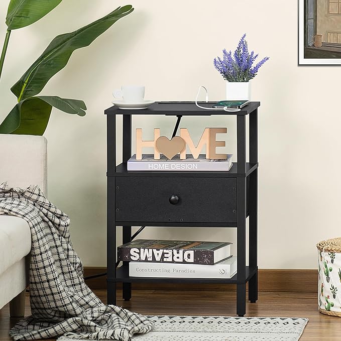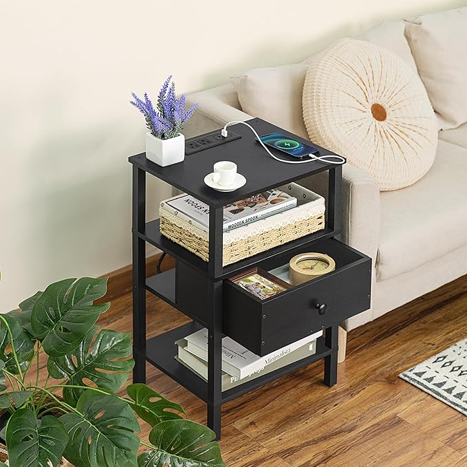 About This [Charge Multiple Devices with Ease] Our retro black bedside tables is equipped with 2 outlets and 2 USB...