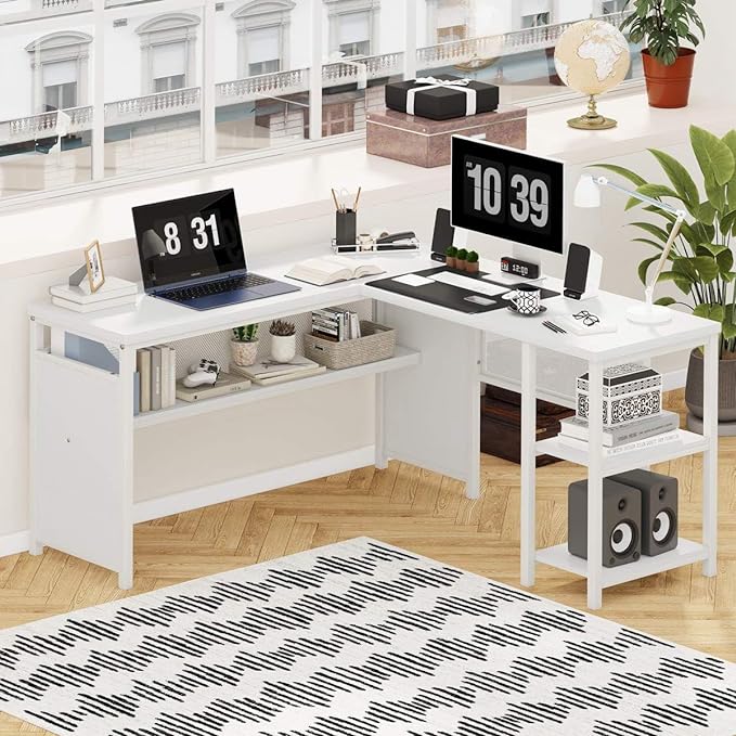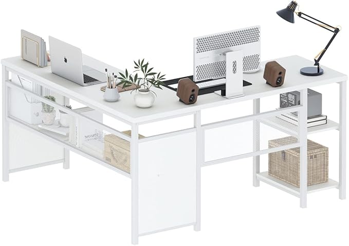 FATORRI L Shaped Computer Desk, Reversible Modern Corner Desk for Home Office, Rustic Wood and Metal Desk with Storage, White Oak (59 Inch)