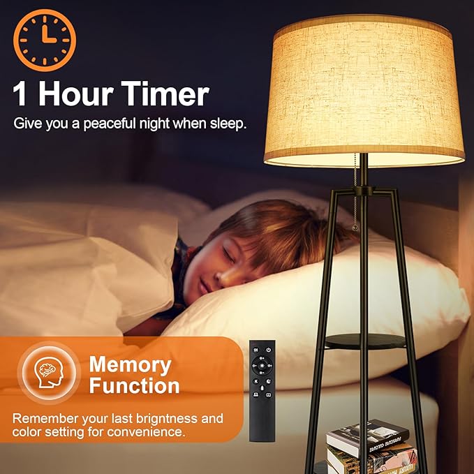 OUTON Tripod Floor Lamp with Shelves, Modern Shelf Floor Lamp with Remote, 4 Color Temperature, Dimmable Tall Standing Corner Lamp with Beige Linen Texture Shade for Living Room, Bedroom, Office