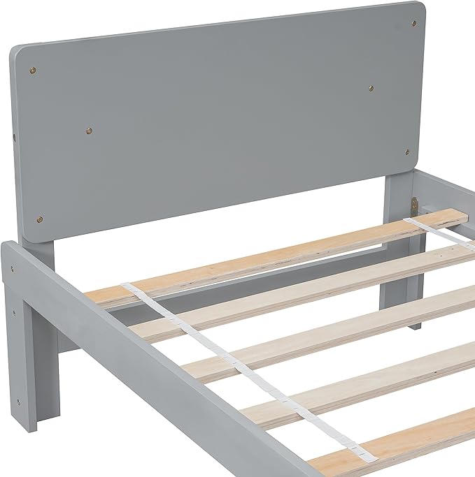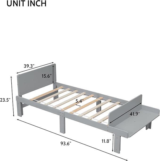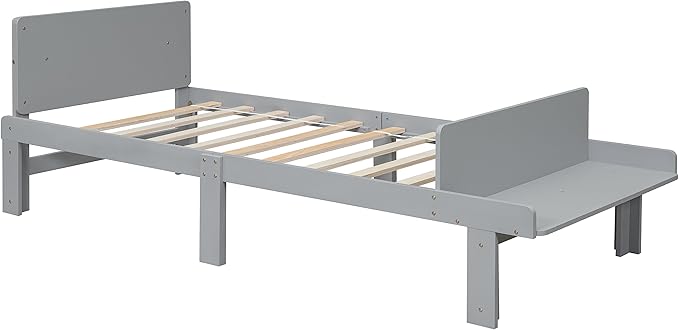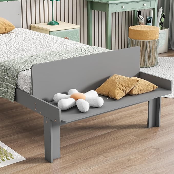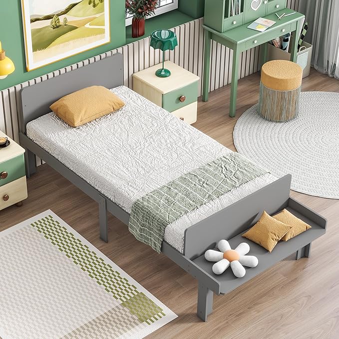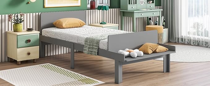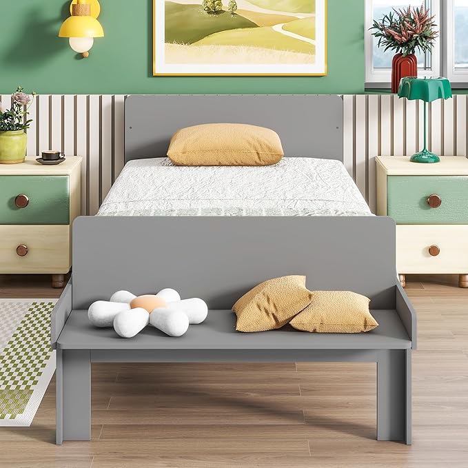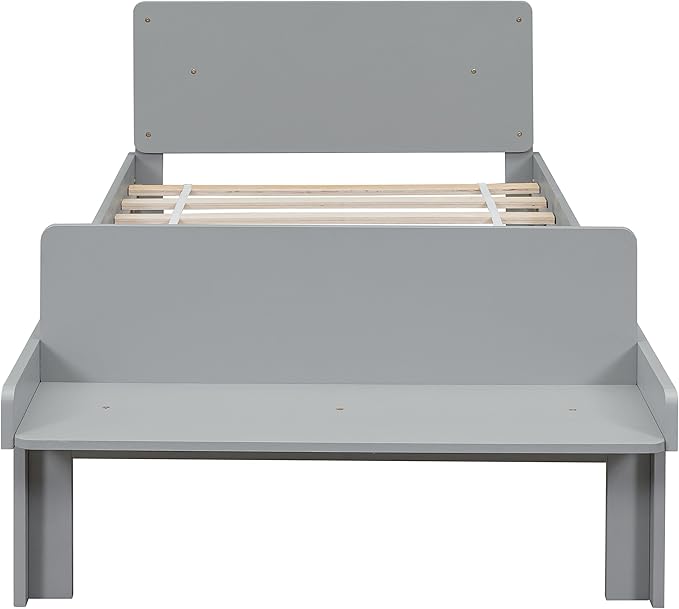 Twin Bed with Footboard Bench, Twin Kid Bed with Headboard, Wood Slat Support, Cute Kid Bed Frame with Book Storage Space, Twin Car Bed for Boys Girls Bedroom, No Box Spring Needed, Grey