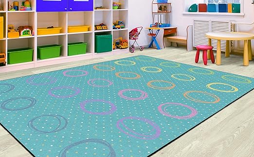 Flagship Carpets Smiley Circle Sampler Abstract Educational Area Rug for Kids Room Seating Décor, Children's Classroom, Play Carpet for Teaching and Playroom, Seats 24, 7'6"x12', Blue & Multi