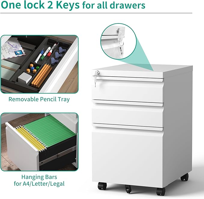 About This ✦【Locking Filing Cabinet】This under desk file cabinet with wheels has a handy lock system that uses just one...