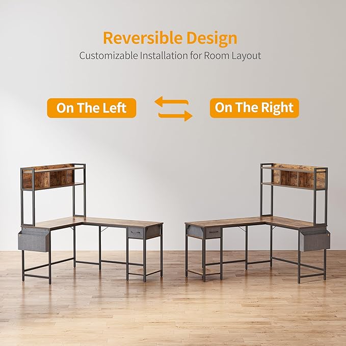 BANTI L Shaped Desk with Hutch, 58 inch Corner Computer Desk with Drawer,Home Office Gaming Table Workstation with Storage Bookshelf, Rustic Brown