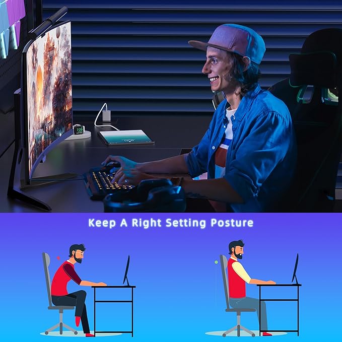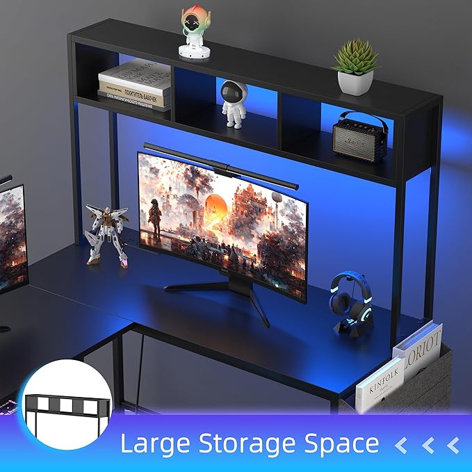 About This 【Modern Computer Desk】L-shaped desk with power outlet, led lights, keyboard tray, headphone hook, storage bag, top box, extra...