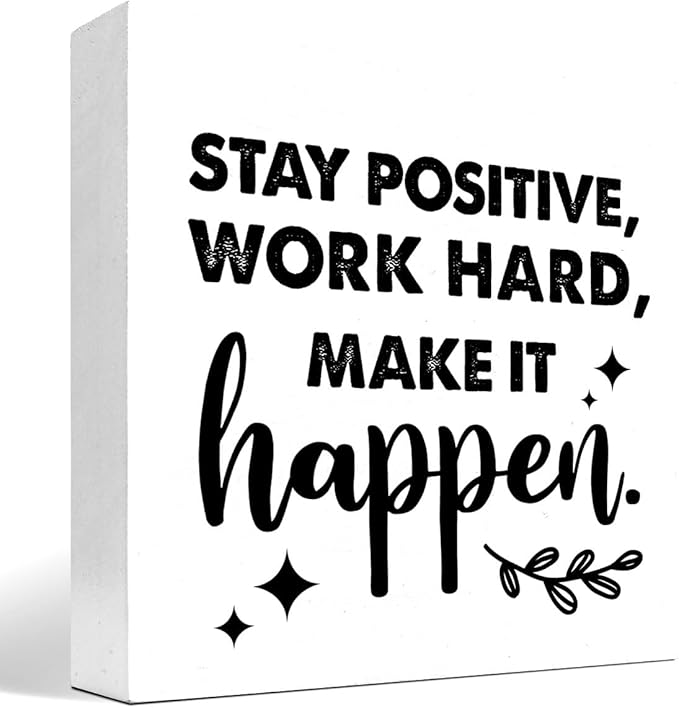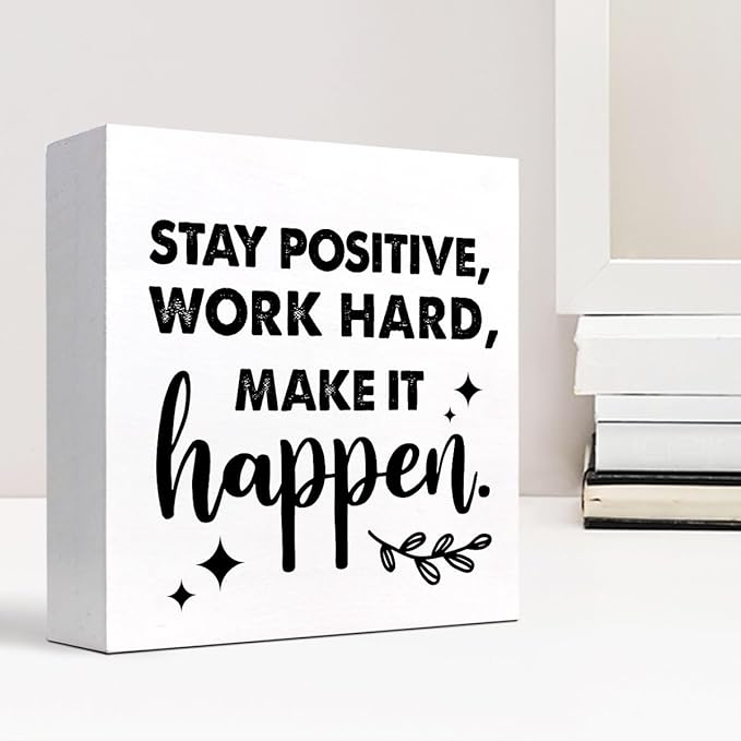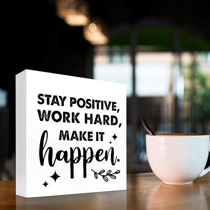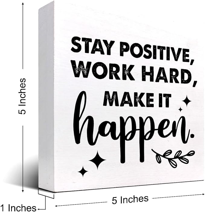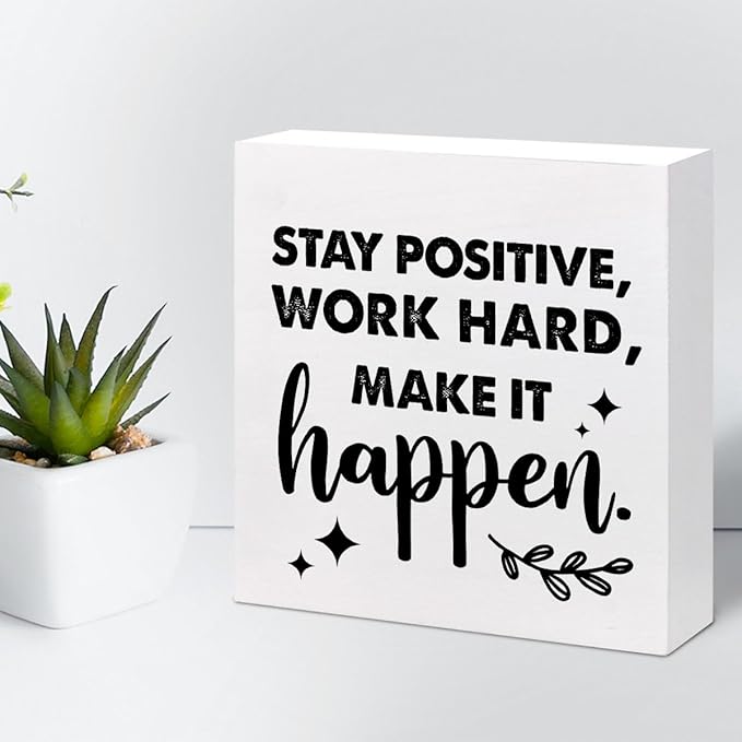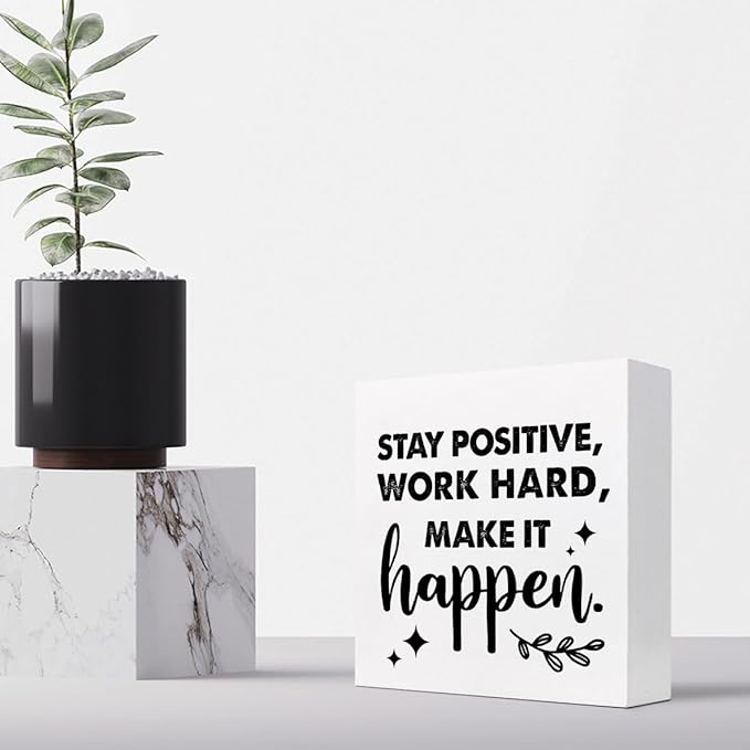 Positive Wood Box Sign Desk Decor,Stay Positive Work Hard Make It Happen Wood Plaque Signs,Rustic Wooden Block Sign Decor for Office Workplace Classroom Shelf Table Decoration C1072