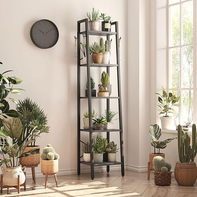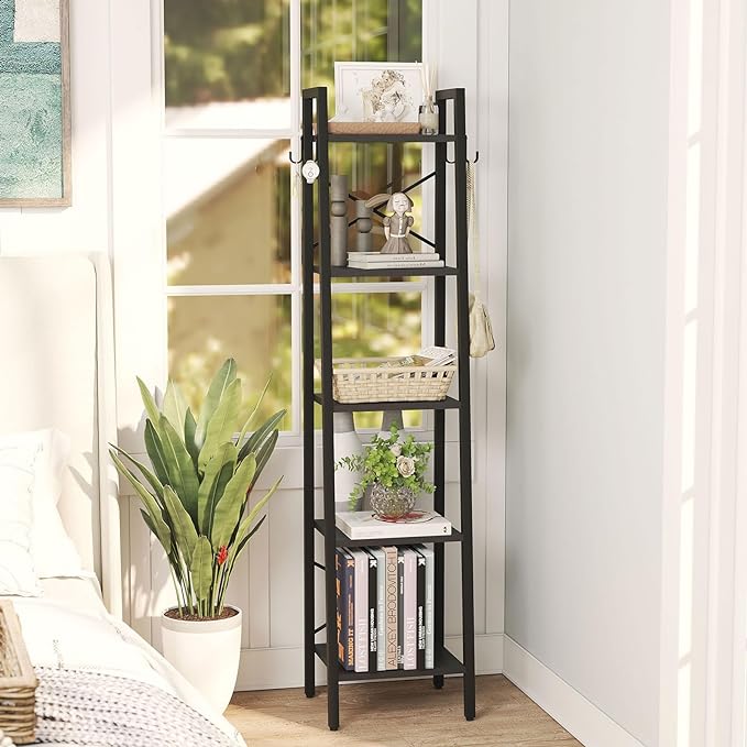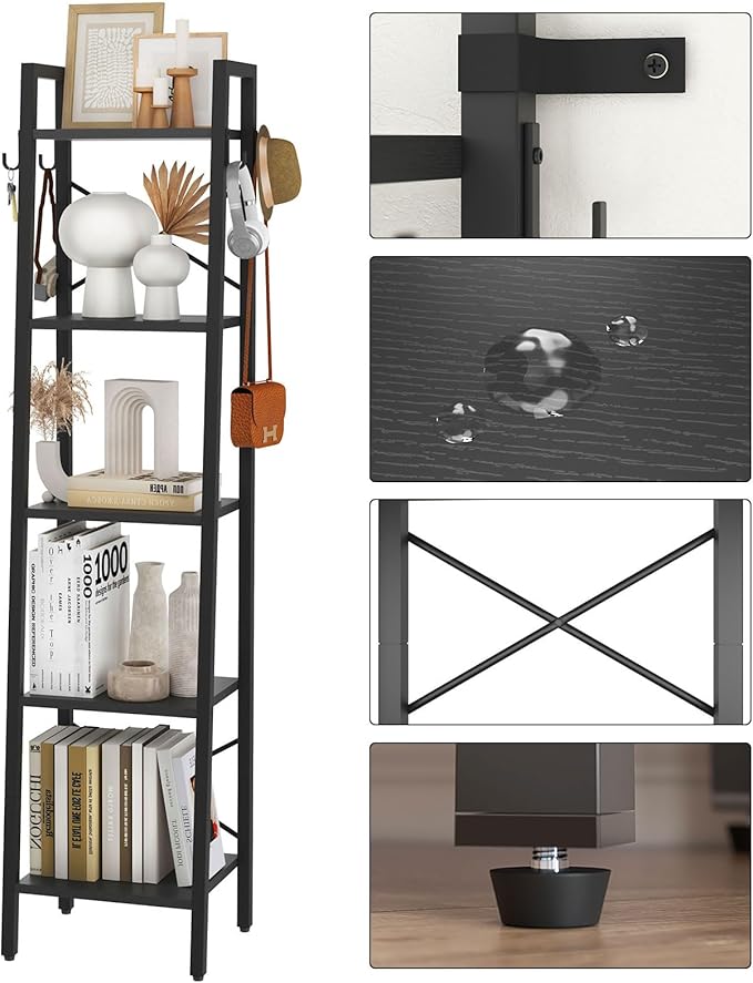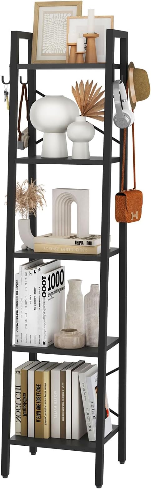 YMYNY 5 Tiers Ladder Bookcase, Industrial Narrow Bookshelf, Open Display Rack with 4 S Hooks, Metal Storage Shelves for Bedroom, Home Office, Living Room, Black, 63H*13.4L*11.8W, UHBC025B