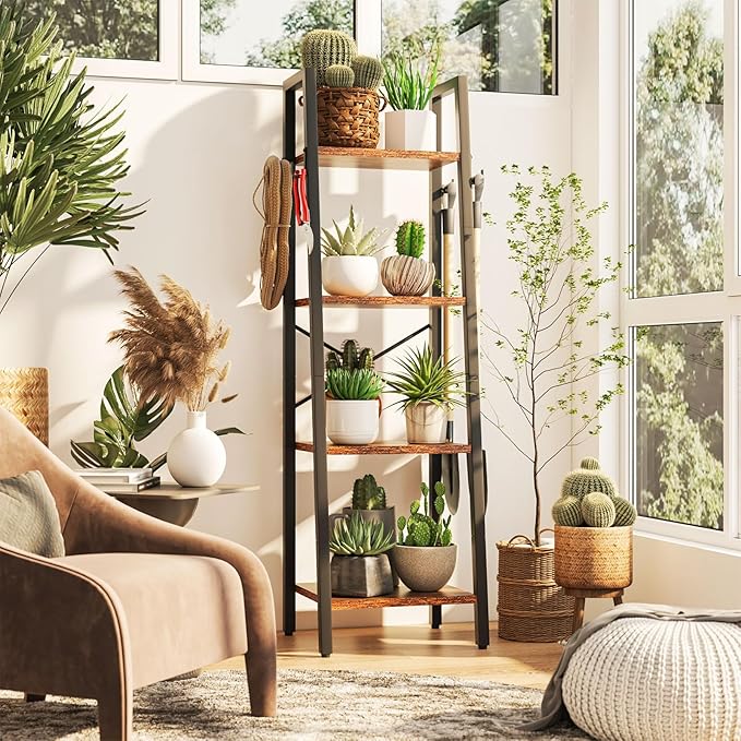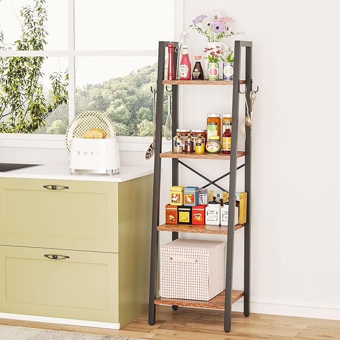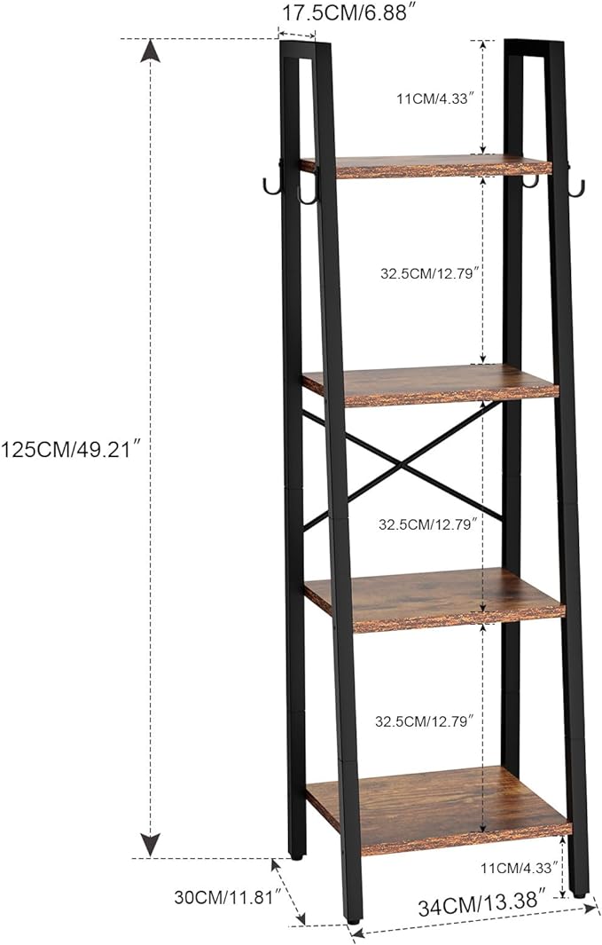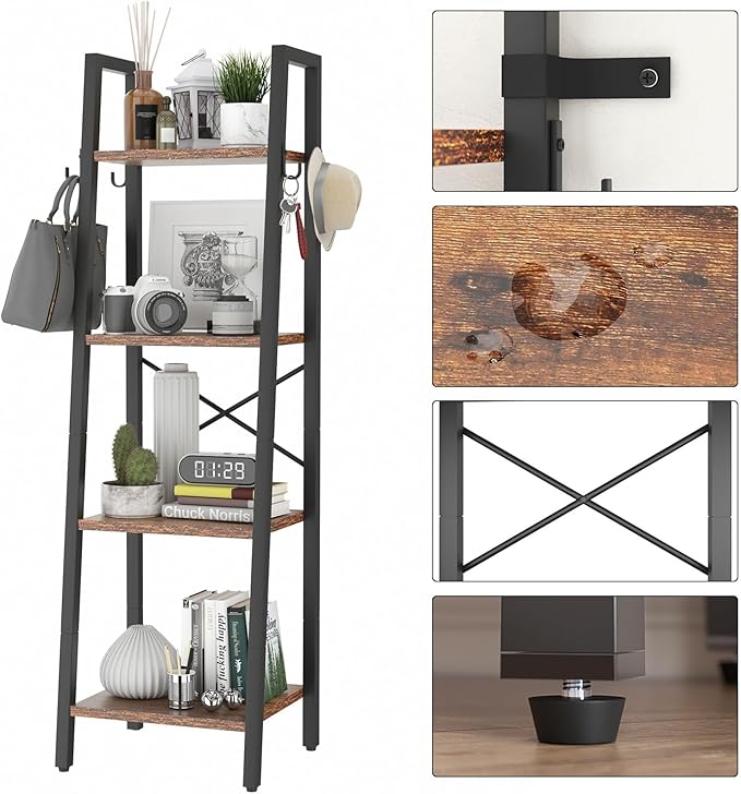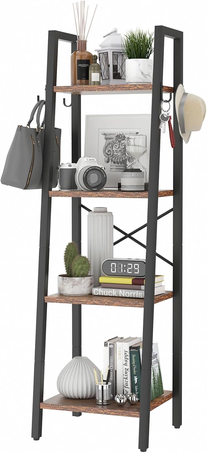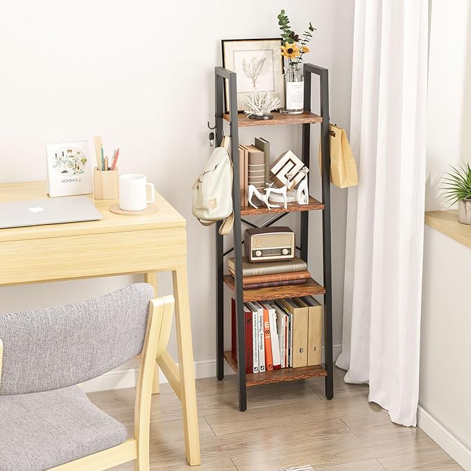 YMYNY 4 Tiers Ladder Bookcase, Industrial Narrow Bookshelf, Open Display Rack with 4 S Hooks, Metal Storage Shelves for Bedroom, Home Office, Living Room, Rustic Brown, 49.2H*13.4L*11.8W, UHBC024H