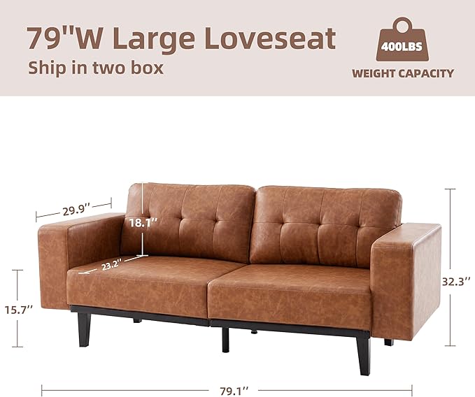 79” Leather Sofa Couches for Living Room, Oversized Loveseat Sofa, 3 Seat Mid Century Modern Couch, Brown Faux Leather Couch Sofa, Love Seat with Solid Wood Leg, Bedroom Couch, Cognac Tan