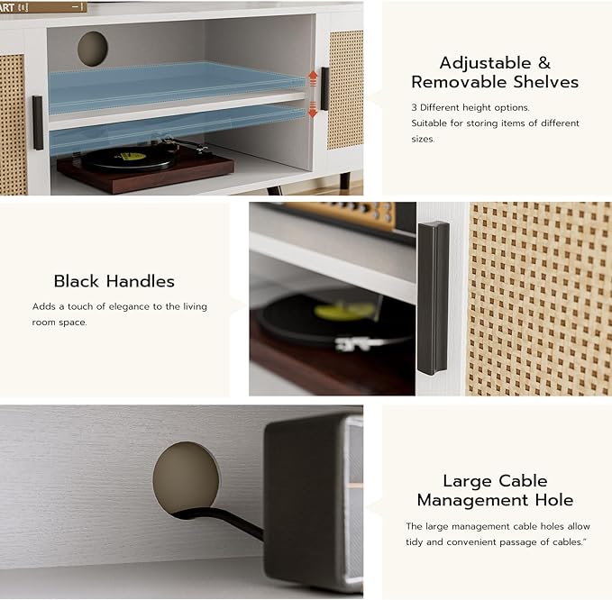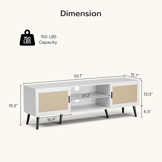 TV Stand for TVs up to 65'', Mid Century Modern Entertainment Center with Rattan Door, Shelves & 2 Cabinets, Boho Media TV Console for Living Room, Bedroom, White