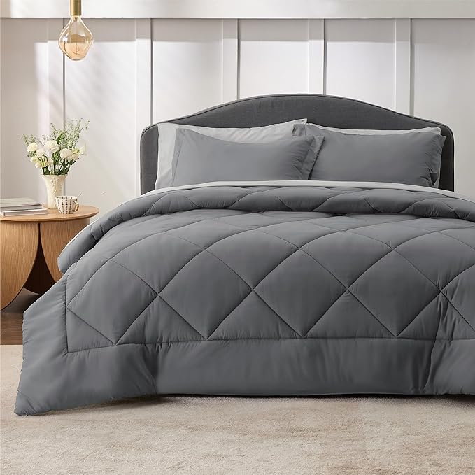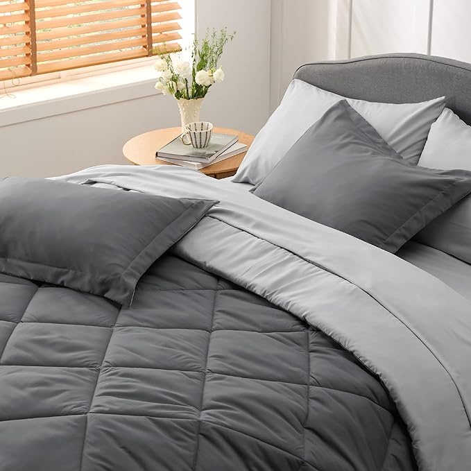 Bedsure Dark Grey Twin Comforter Set - 5 Pieces Reversible Twin Bed in a Bag for College, Extra Long Twin Bed Set Dark Grey with Comforters, Sheets, Pillowcase & Sham