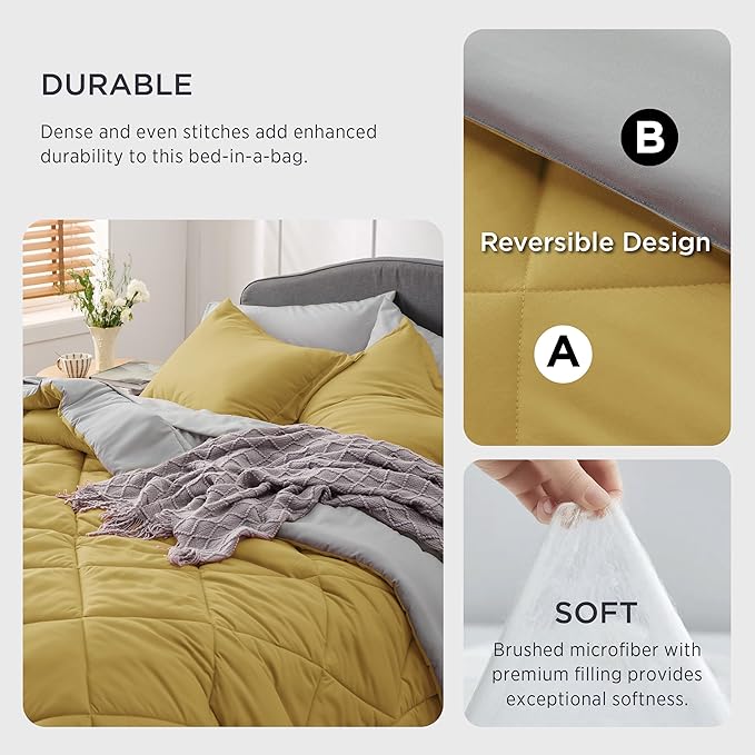 Bedsure Mustard Yellow California King Comforter Set - 7 Pieces Reversible Cal King Bed in a Bag, Cal King Mustard Yellow and Grey Bed Set with Comforters, Sheets, Pillowcases & Shams