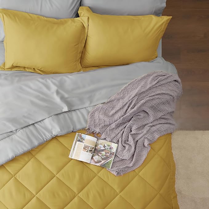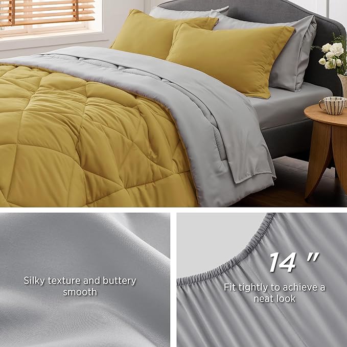 Bedsure Mustard Yellow Queen Comforter Set - 7 Pieces Reversible Queen Bed in a Bag, Queen Bed Set Mustard Yellow and Grey with Comforters, Sheets, Pillowcases & Shams