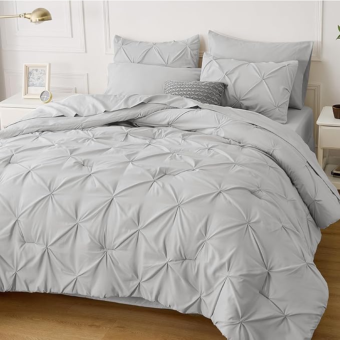 Bedsure Light Grey Comforter Set Queen - Bed in a Bag Queen 7 Pieces, Pintuck Beddding Sets Green Bed Set with Comforter, Sheets, Pillowcases & Shams