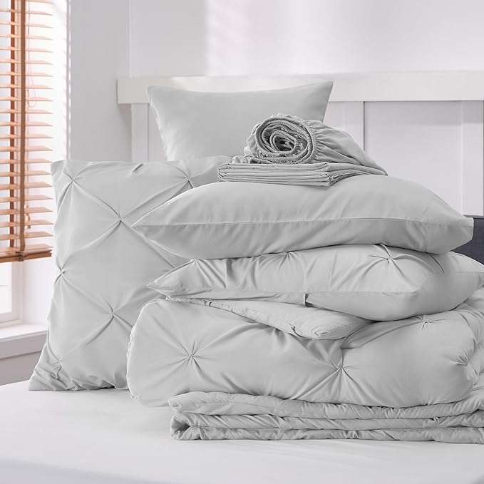 Bedsure Light Grey Comforter Set Queen - Bed in a Bag Queen 7 Pieces, Pintuck Beddding Sets Green Bed Set with Comforter, Sheets, Pillowcases & Shams