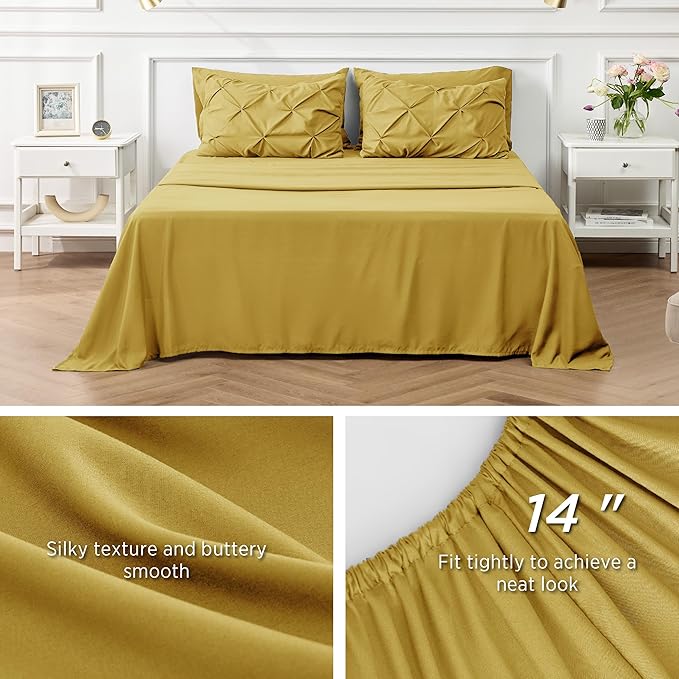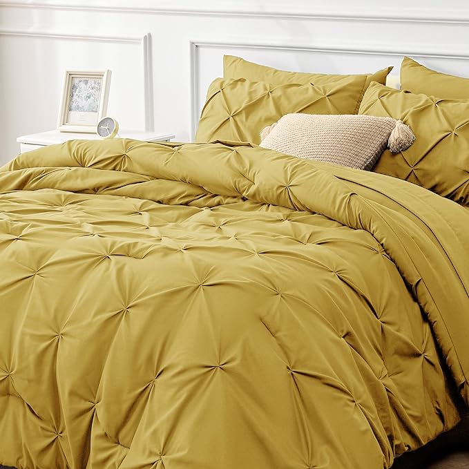 Bedsure Mustard Yellow King Size Comforter Set - Bedding Set King 7 Pieces, Pintuck Bed in a Bag Green Bed Set with Comforter, Sheets, Pillowcases & Shams