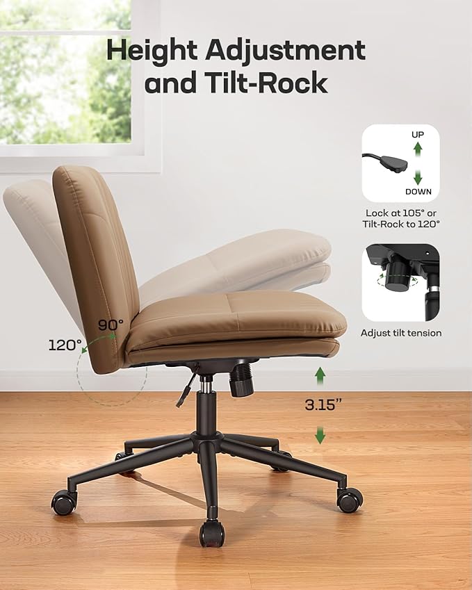 Marsail Armless-Office Desk Chair with Wheels: PU Leather Cross Legged Wide Chair,Comfortable Adjustable Swivel Computer Task Chairs for Home,Office,Make Up,Small Space,Bed Room, Brown
