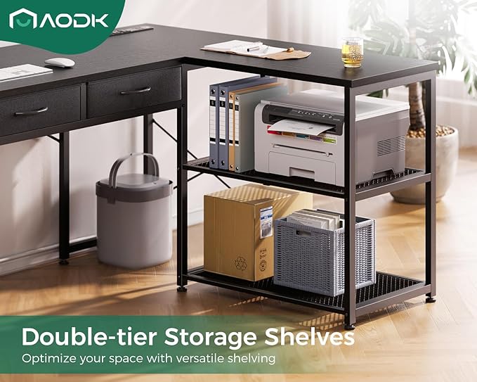 AODK 53 Inch L Shaped Computer Desk with Drawers, Corner Desk with Power Outlets & Reversible Storage Shelves, Movable CPU Stand for Home Office Gaming, Black