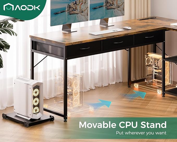 AODK 61 Inch L Shaped Computer Desk with Drawers, Corner Desk with Power Outlets & Reversible Storage Shelves, Movable CPU Stand for Home Office Gaming, Vintage