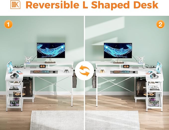 ODK 48 Inch Gaming Desk with USB Charging Ports and LED Lights, Reversible L Shaped Computer Desk with Storage Shelves & Monitor Stand, Corner Home Office Desk Table with Power Outlets, White