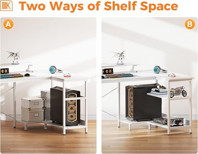 ODK 58 Inch Gaming Desk with USB Charging Ports and LED Lights, Reversible L Shaped Computer Desk with Storage Shelves & Monitor Stand, Corner Home Office Desk Table with Power Outlets, White