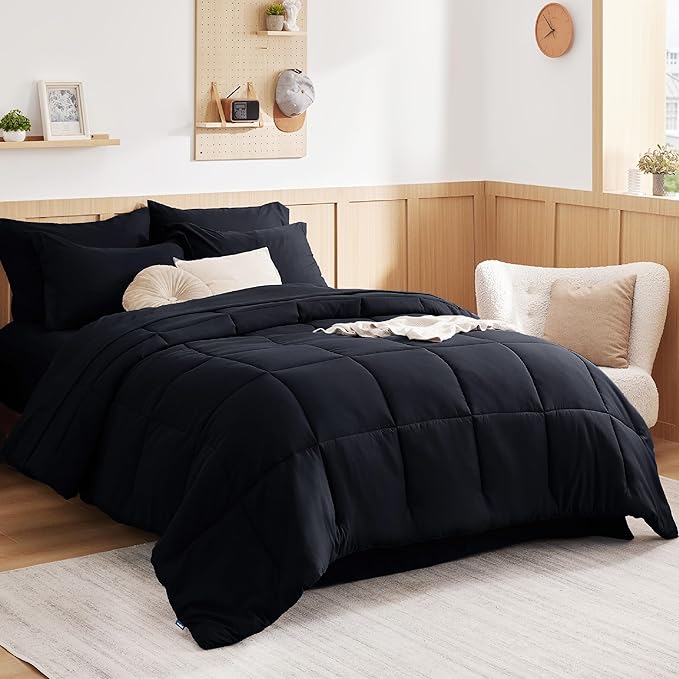 Bedsure Black Twin Comforter Set - 5 Pieces Solid Twin Bed in a Bag, Twin Bed Set Black with Quilted Warm Fluffy Comforters, Sheets, Pillowcase & Sham