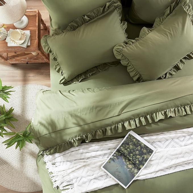Anluoer Full Comforter Set 7 Piece, Olive Green Bed in a Bag with Sheets, All Season Ruffle Shabby Chic Bedding Sets with 1 Comforter, 2 Pillow Shams, 2 Pillowcases, 1 Flat Sheet, 1 Fitted Sheet