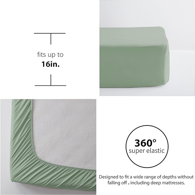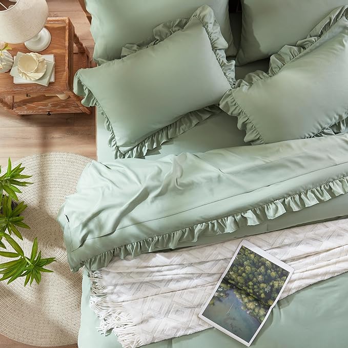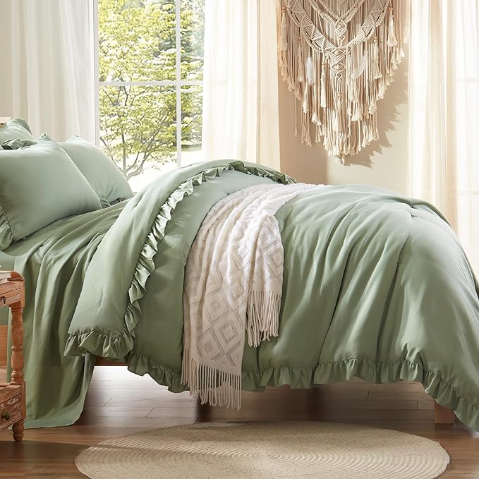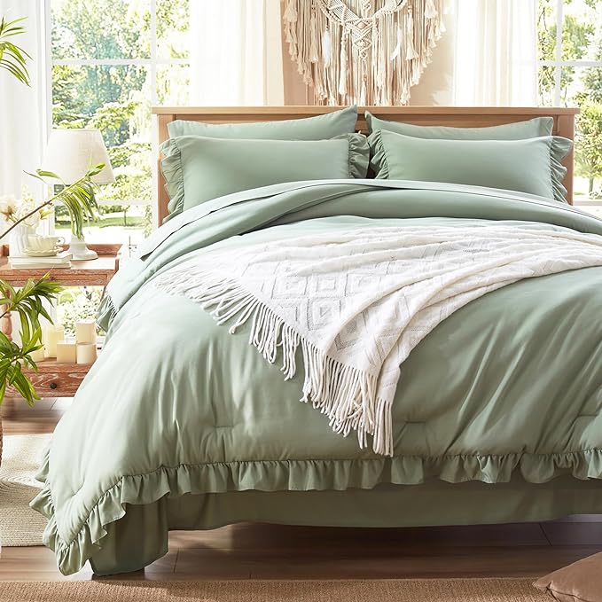 Anluoer Queen Comforter Set 7 Piece, Sage Green Bed in a Bag with Sheets, All Season Ruffle Shabby Chic Bedding Sets with 1 Comforter, 2 Pillow Shams, 2 Pillowcases, 1 Flat Sheet, 1 Fitted Sheet