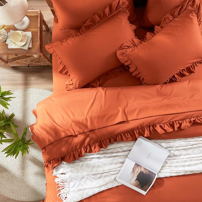 Anluoer Full Comforter Set 7 Piece, Burnt Orange Bed in a Bag with Sheets, All Season Ruffle Shabby Chic Bedding Sets with 1 Comforter, 2 Pillow Shams, 2 Pillowcases, 1 Flat Sheet, 1 Fitted Sheet