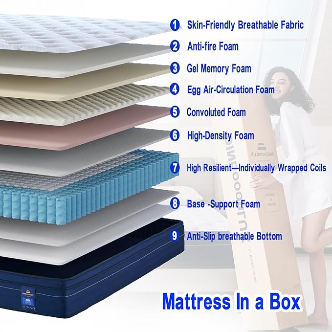 Queen Mattress,14 Inch Gel Memory Foam Hybrid Mattress in a Box,Motion Isolation Individually Pocket Innerspring ,Pressure Relief,Back Pain Relief,Breathable,Medium Firm,Non-Fiberglass Mattress
