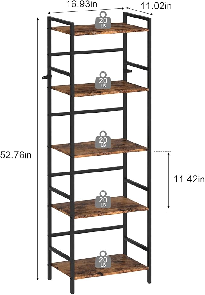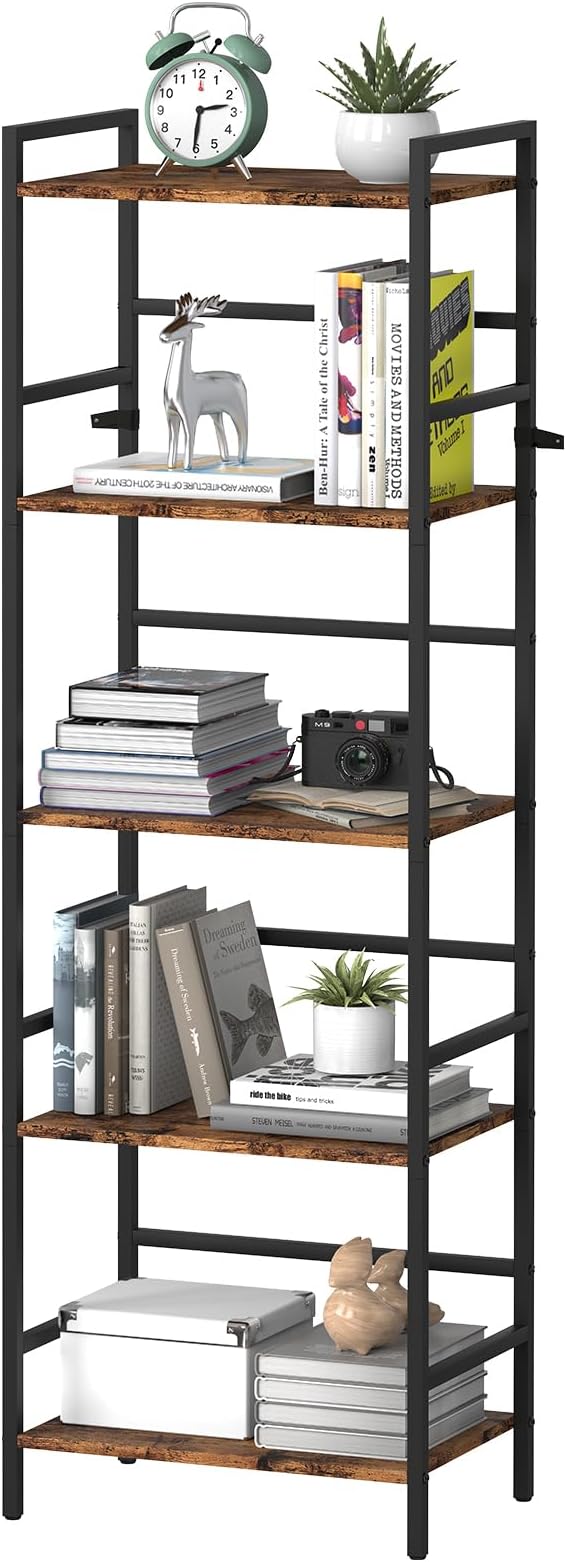 DOMYDEVM Tall Bookshelf, 5 Tier Free Standing Shelves, Wood Storage Shef Unit with Metal Frame, Brown Bookshelf for Small Spaces, Office, Living Room, Bedroom
