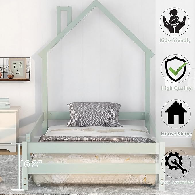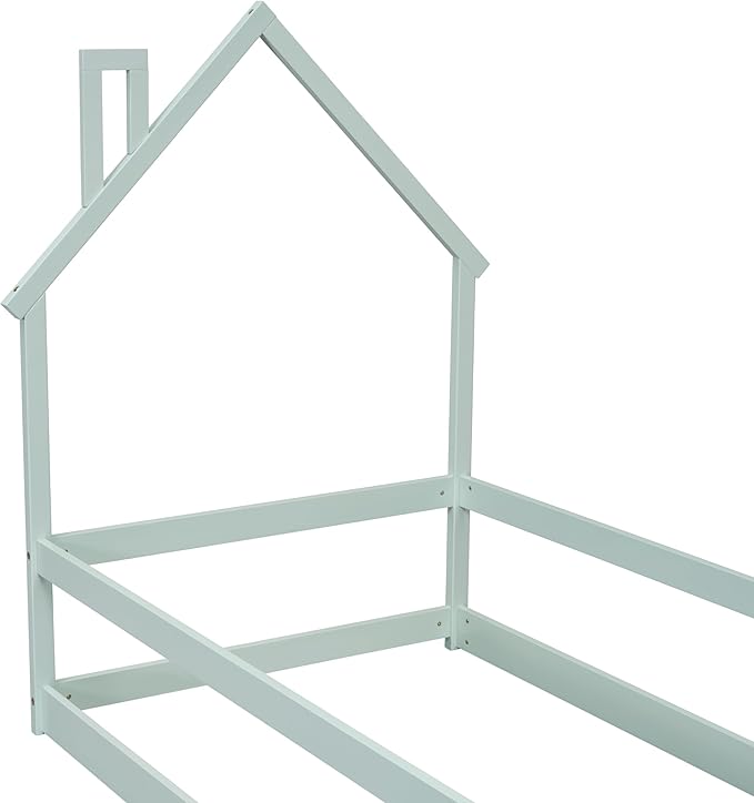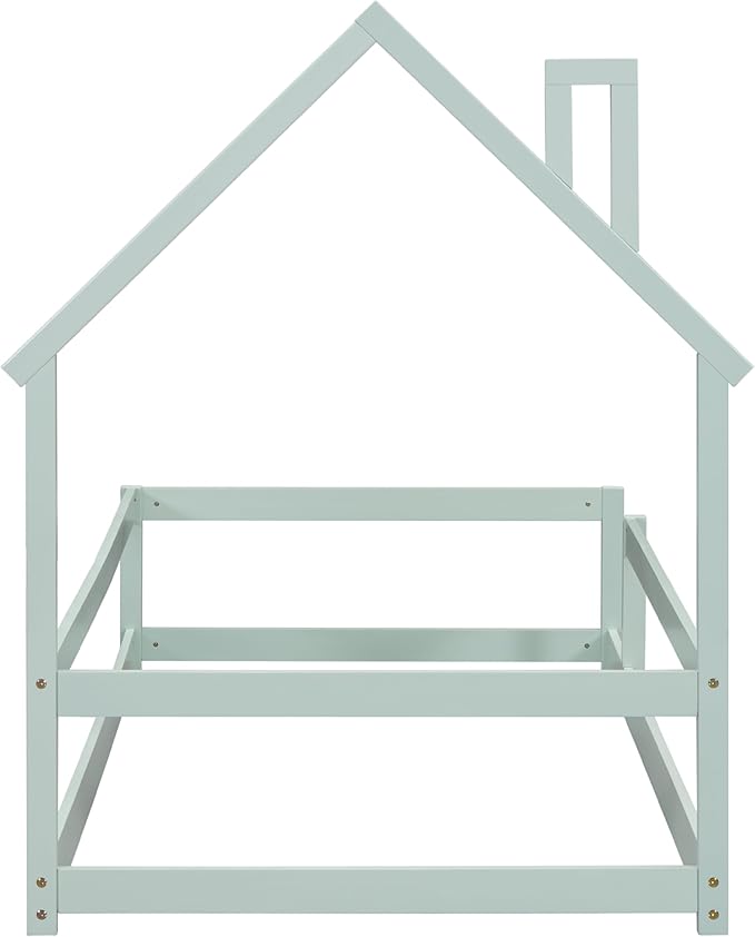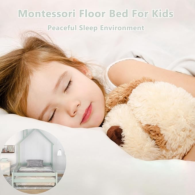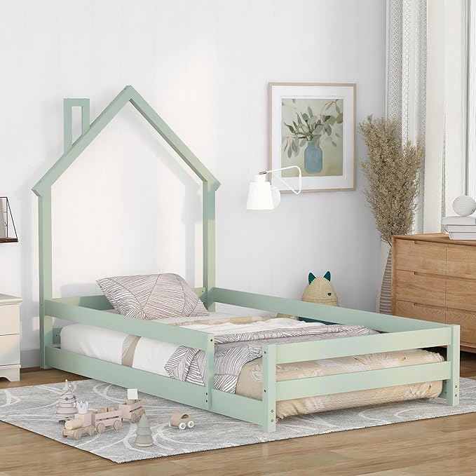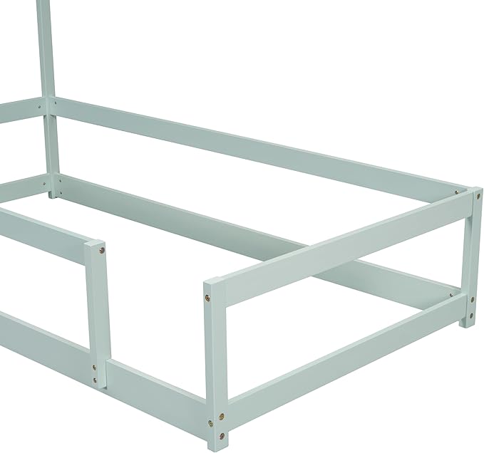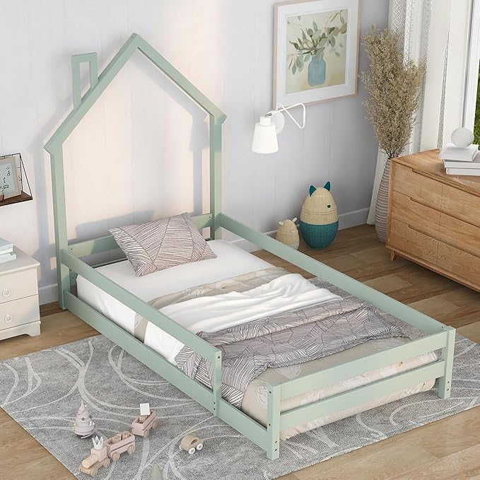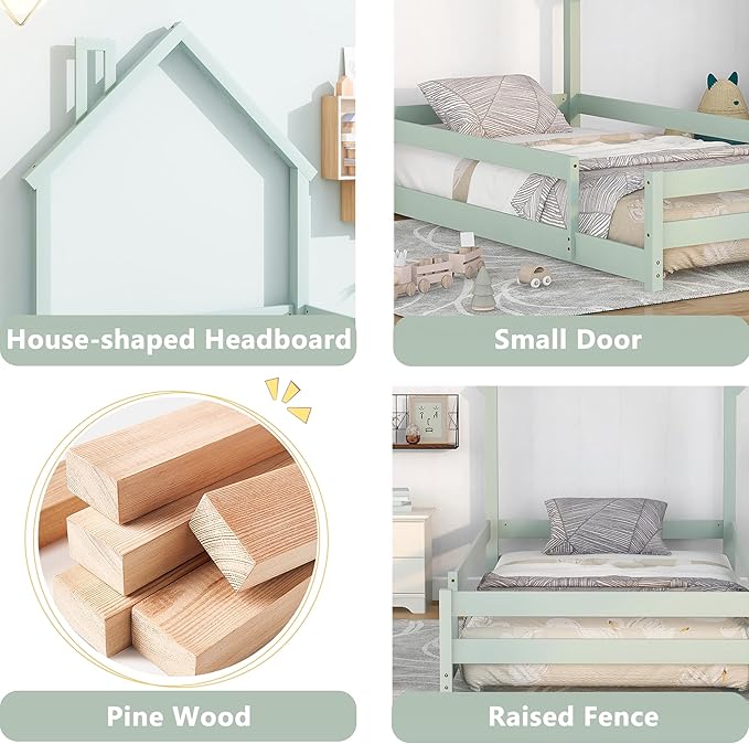Bellemave Twin Size House-Shaped Headboard Floor Bed with Fences, Wooden Montessori Bed for Kids,House Bed Twin Frame for Girls,Boys (Light Green)