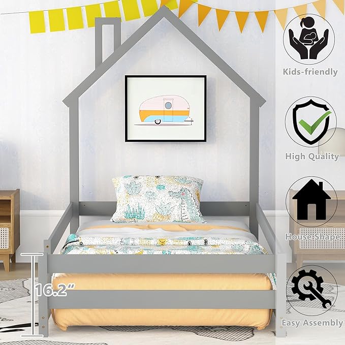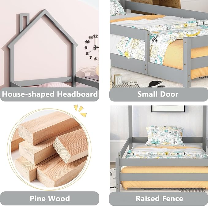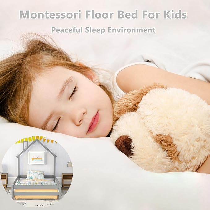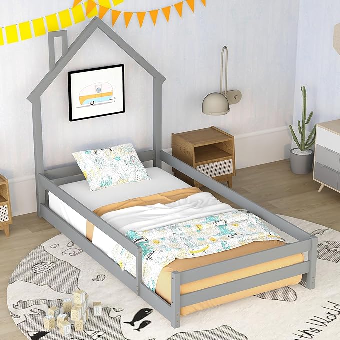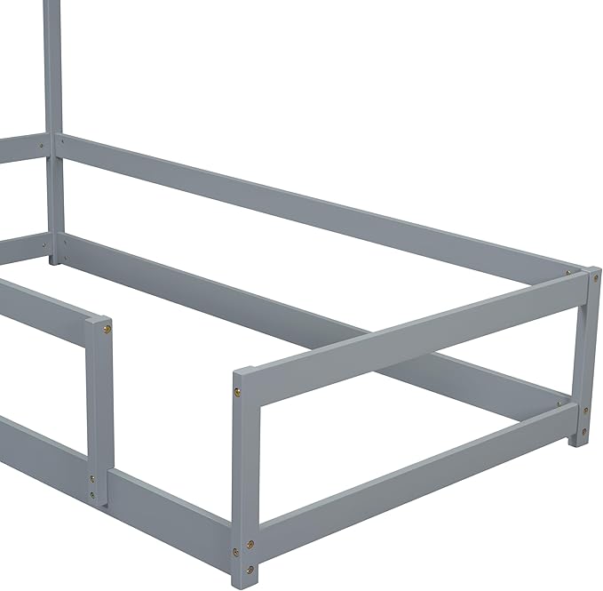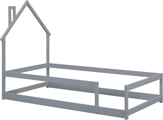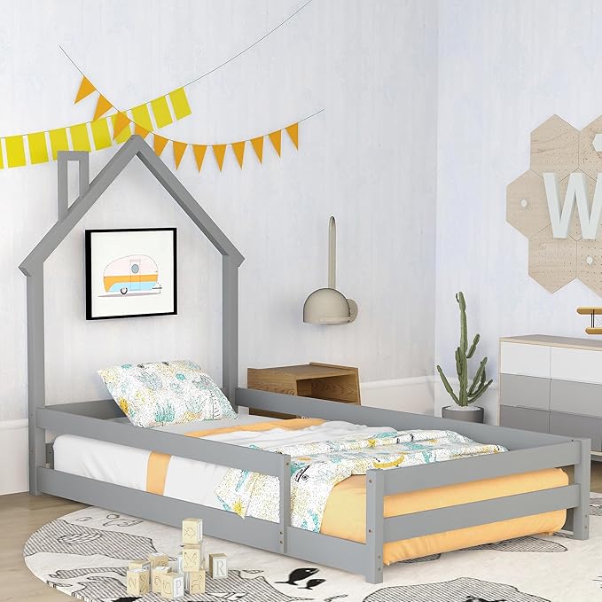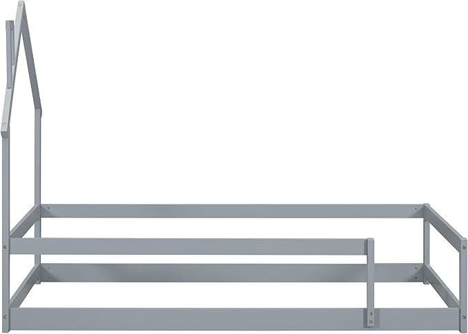 Bellemave Twin Size House-Shaped Headboard Floor Bed with Fences, Wooden Montessori Bed for Kids,House Bed Twin Frame for Girls,Boys (Gray)