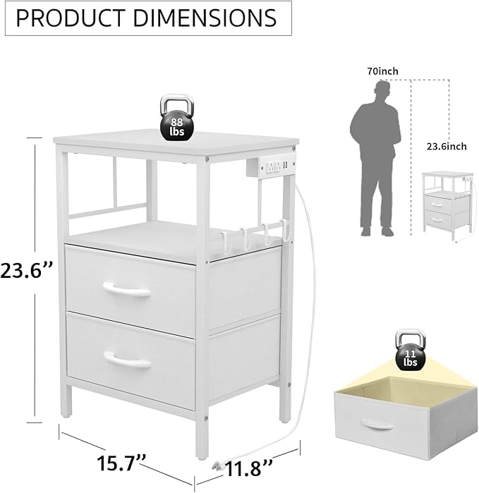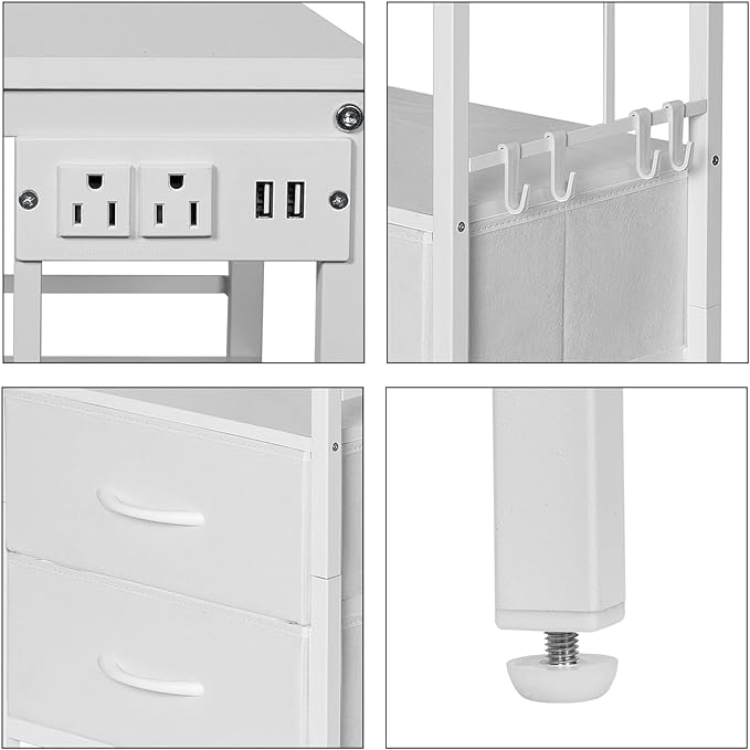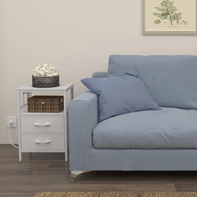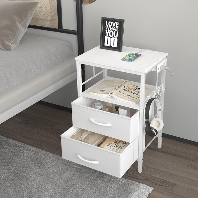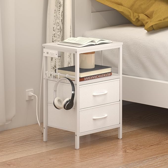 Nightstand with Charging Station, Side Table with Fabric Drawers and Open Shelf, Night Stand for Bedroom Decor, Bedside Table with USB Ports & Outlets (White,1)